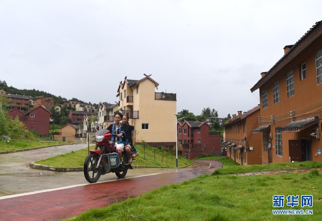 搬迁到广西南丹县“千家瑶寨·万户瑶乡”里湖王尚易地扶贫搬迁安置点的当脚屯村民骑行在安置点内的道路上(2020年8月6日摄)。