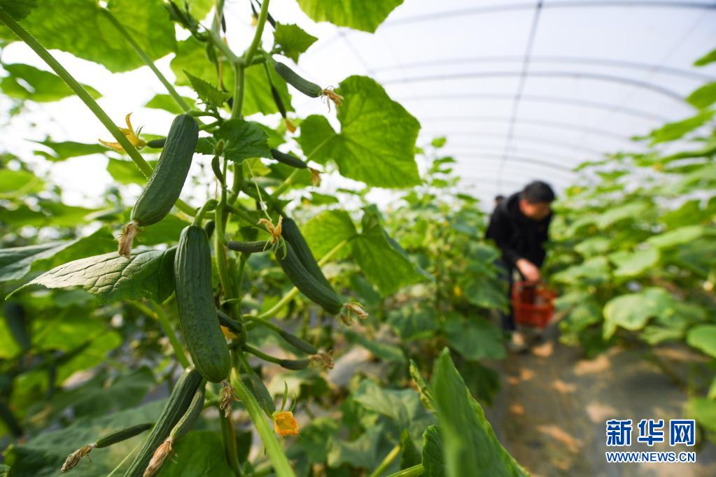 4月8日,游客在织里镇一处精品农业园的生态种植大棚内采摘春季首批成熟的水果黄瓜。