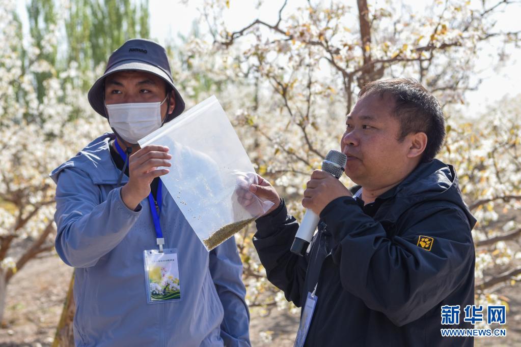 4月11日,在铁门关市一处香梨示范园,技术人员展示蜜蜂采集的高活性花粉。新华社记者 丁磊 摄