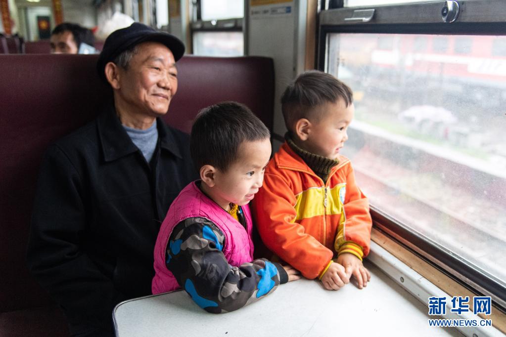 4月11日,在7266次列车上,爷爷带着两个孙子望向窗外。新华社记者 陈思汗 摄