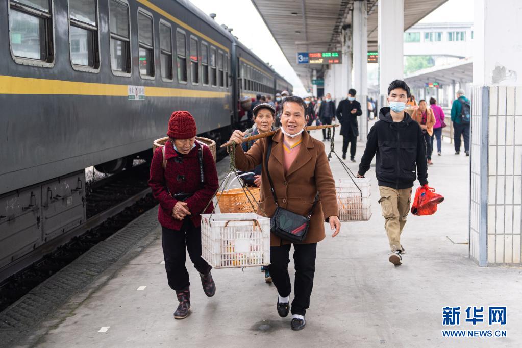 4月11日,乘坐7265次列车的乘客背着售空的蔬菜筐在吉首站上车回家。新华社记者 陈思汗 摄