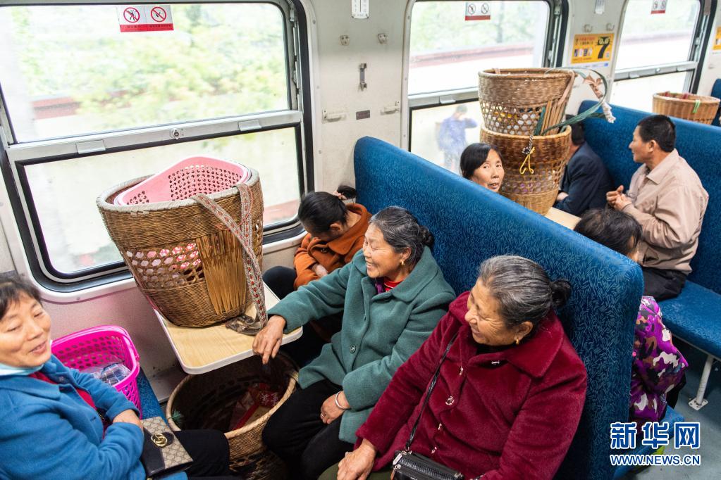 4月11日,已将蔬菜全部售出的乘客在7265次列车上围着空背篓聊天。新华社记者 陈思汗 摄