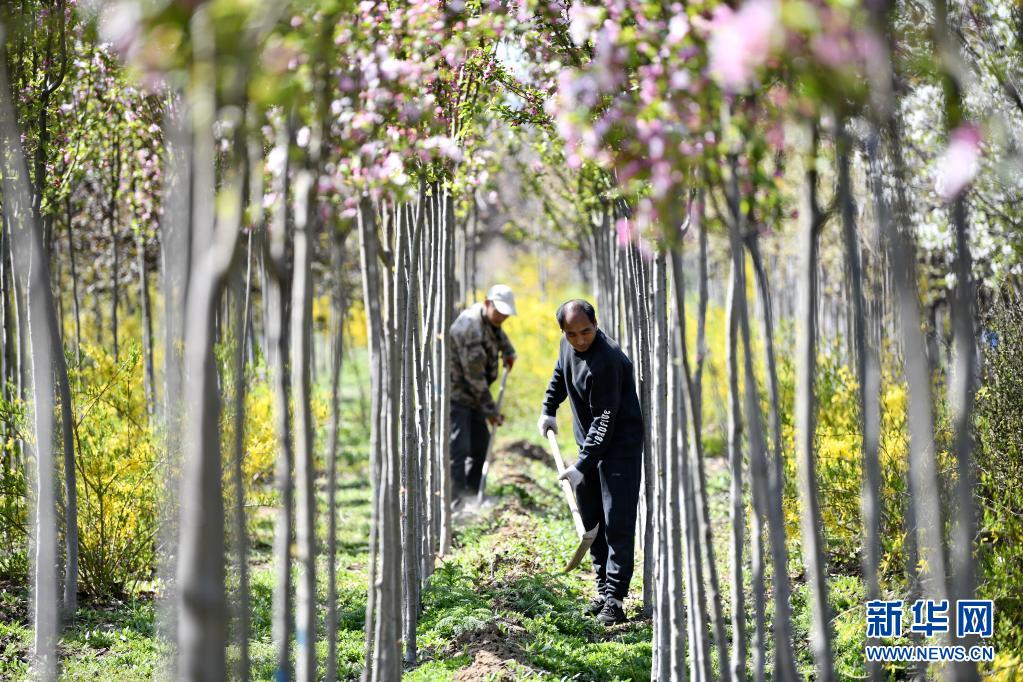 4月15日,河北省唐山市丰南区黄各庄镇西杨家泊村一处苗木基地的工人在打理种植的苗木。近年来,河北省唐山市丰南区瞄准市场需求,抓住美丽乡村建设的契机,引导农民大力发展苗木花卉种植产业,通过“线上”和“线下”相结合的销售模式,进入周边县市及北京、天津等地市场,在扮靓城乡的同时为种植户带来良好收益。新华社记者 牟宇 摄