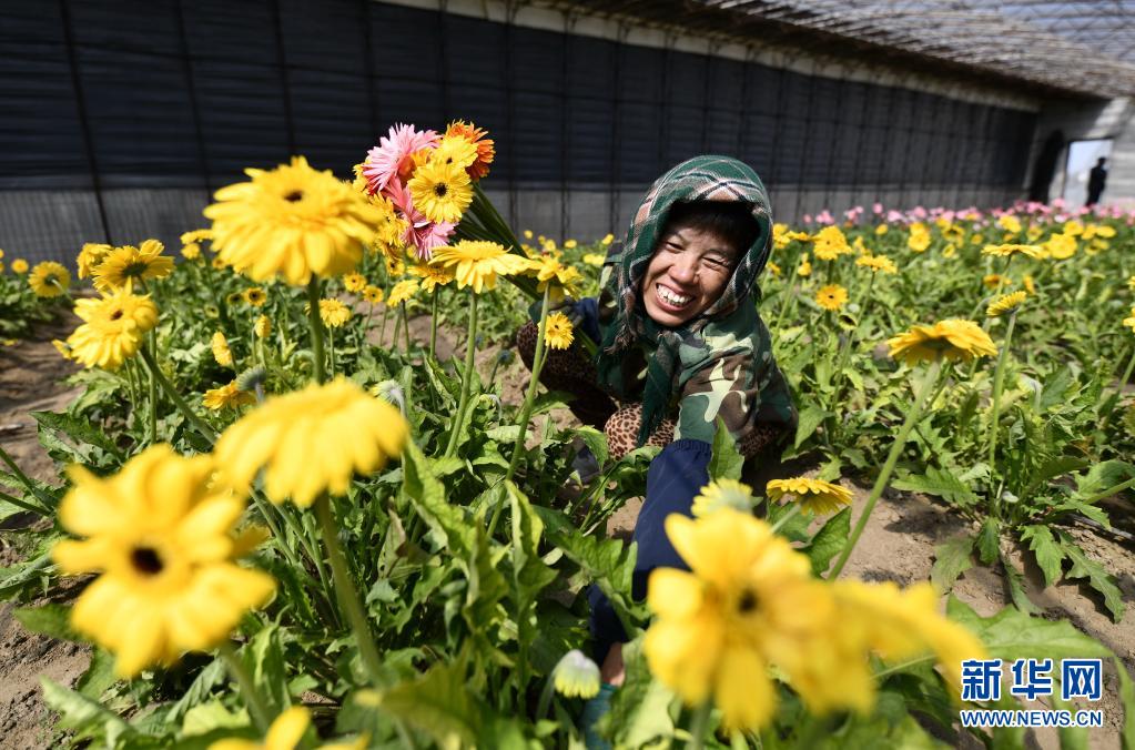 4月15日,河北省唐山市丰南区大新庄镇柳林三村的花农在采摘非洲菊。新华社记者 牟宇 摄