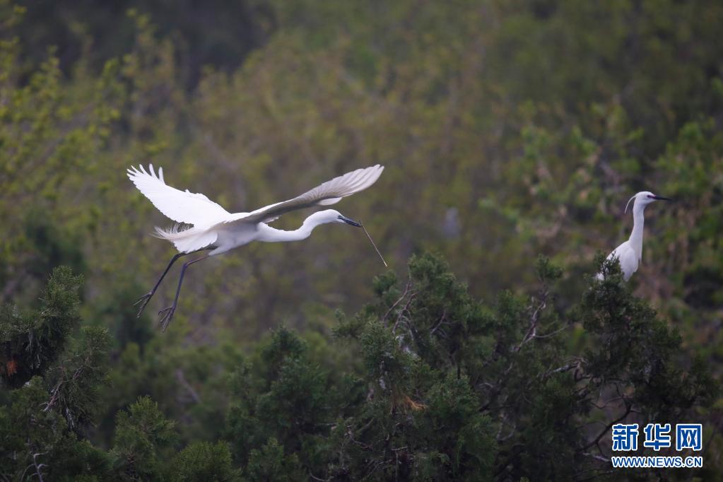 4月16日,在江苏泗洪洪泽湖湿地国家级自然保护区,鹭鸟在叼枝筑巢。