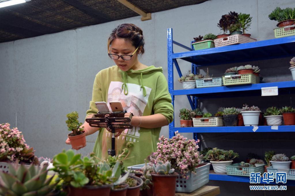 福建省宁化县安乐镇谢坊村村民在直播间售卖多肉盆栽(4月14日摄)。