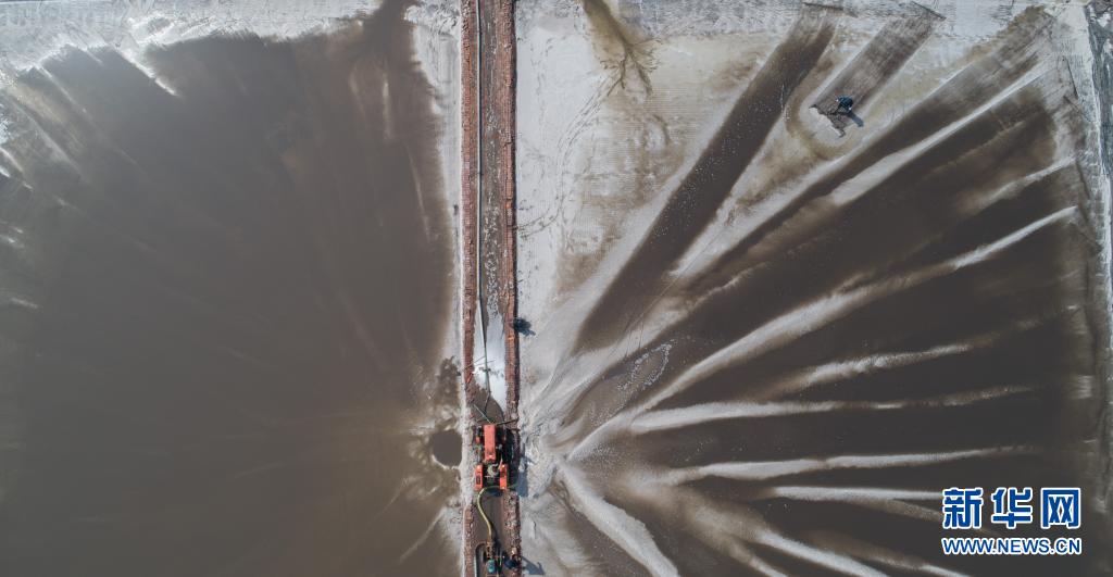 4月19日,在河北省黄骅市前沙盐场,工人在进行扒盐作业(无人机照片)。