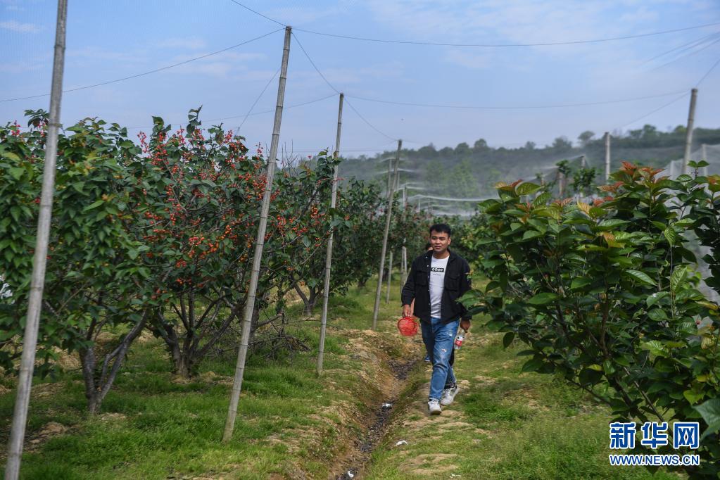 4月20日,游客在泗安镇毛家村的樱桃果园内采摘樱桃,体验乡村采摘游的乐趣。