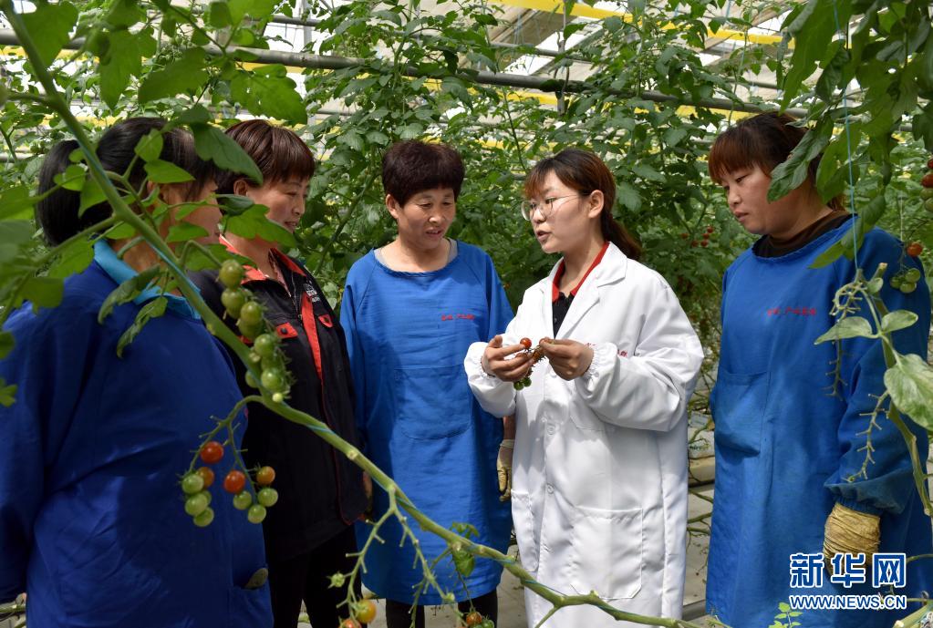 4月20日,范玉青在蔬菜大棚为工人讲解小西红柿管理技术。新华社记者 朱旭东 摄
