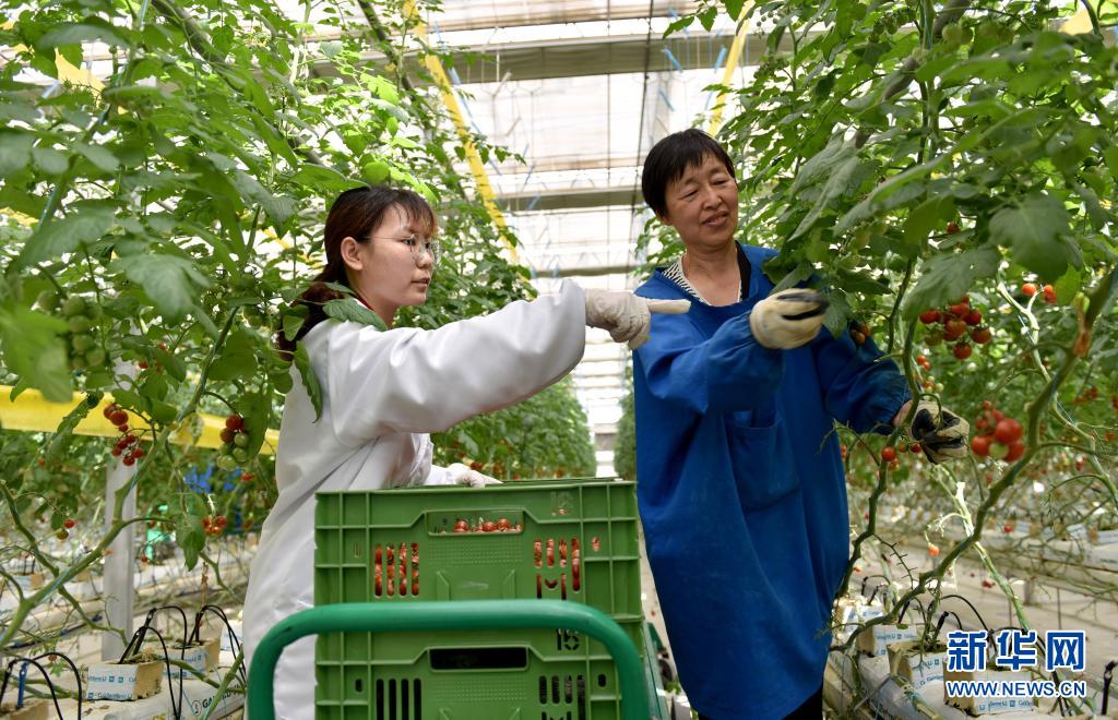 4月20日,范玉青(左)指导工人在蔬菜大棚采摘小西红柿。新华社记者 朱旭东 摄