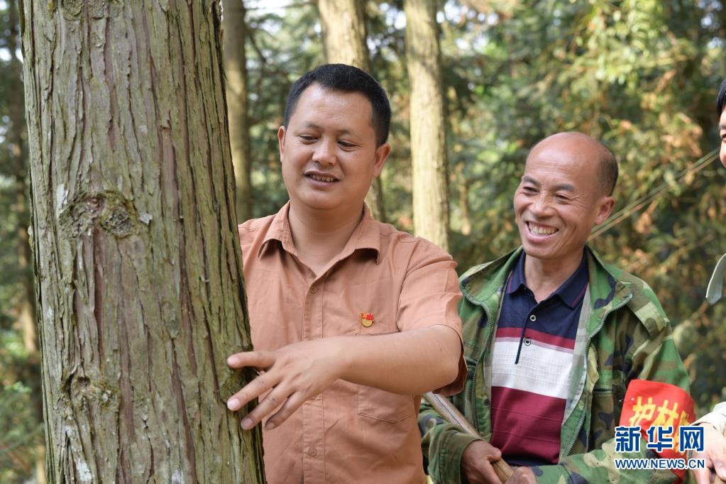 4月22日,在贵州省榕江县定威水族乡定旦村,罗朝兵(左)带领护林员巡山时,查看林木的长势。新华社记者 杨楹 摄
