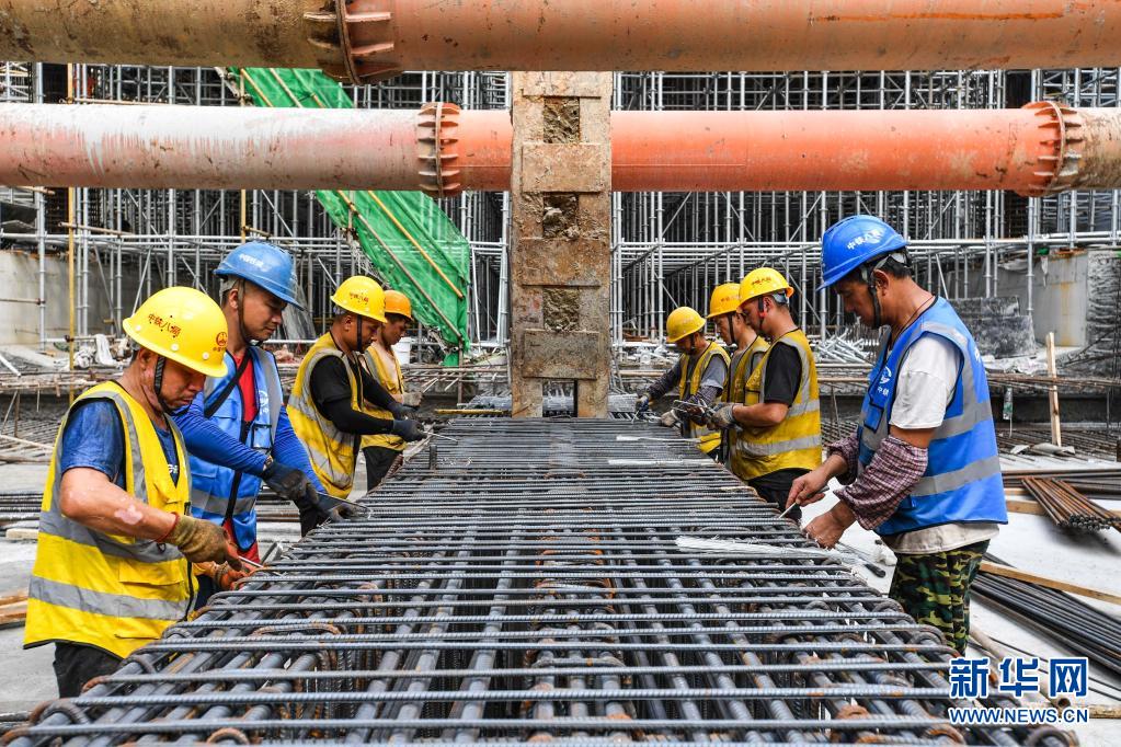 工人在广州地铁七号线二期水西北站施工现场绑扎钢筋(4月23日摄)。