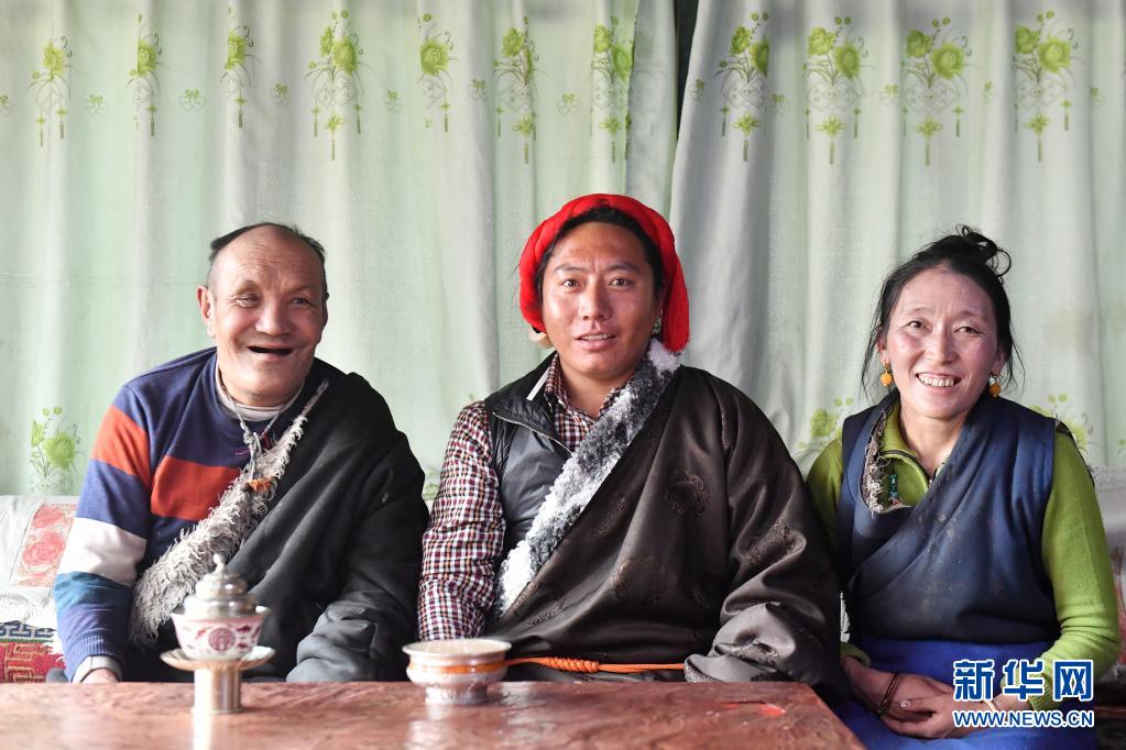 央多老人(左)和养子及养子的妻子在家里合影(4月15日摄)。新华社记者 孙瑞博 摄
