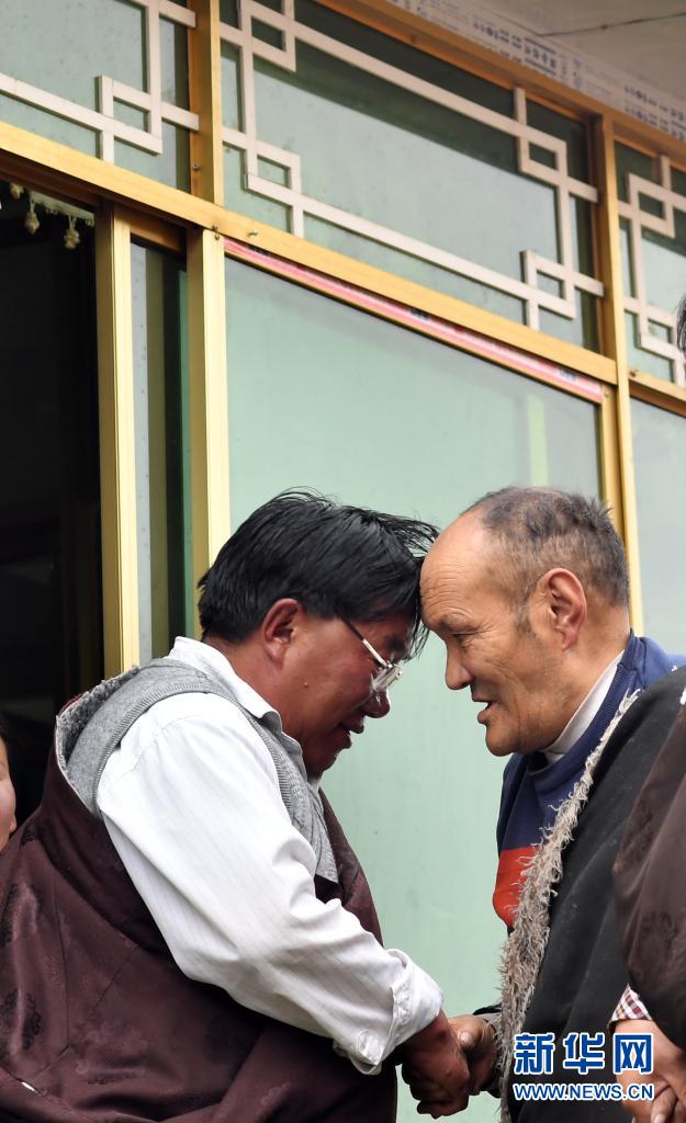 央多老人(右)在和看望他的村干部行碰头礼(4月15日摄)。新华社记者 觉果 摄