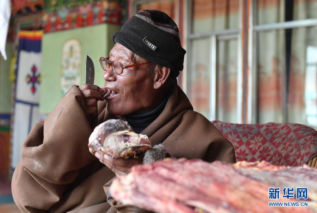 索朗多杰在吃牦牛肉(4月15日摄)。新华社记者 孙瑞博 摄