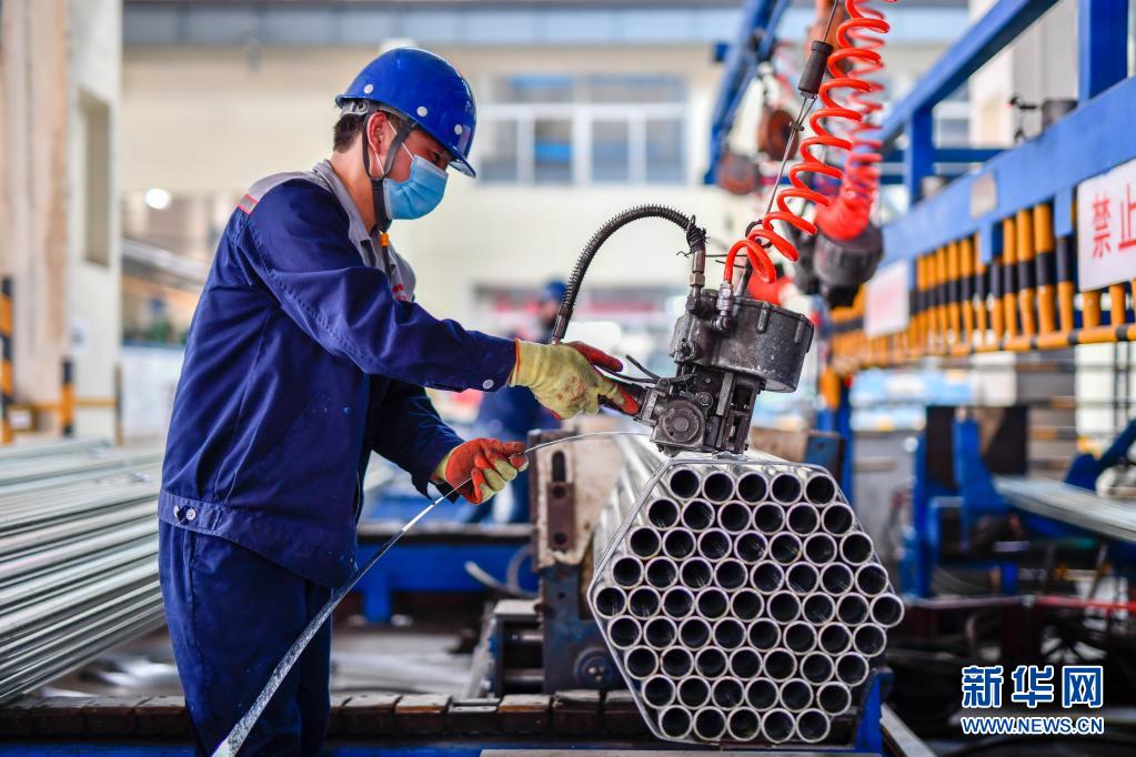 5月7日,工人在由天津转移而来的唐山正元管业有限公司车间内打包管材。