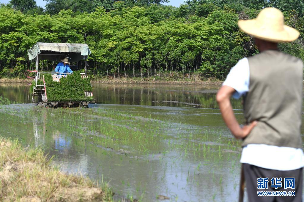 初夏时节,在安徽省合肥市肥西县花岗镇,当地农民抢抓农时在田间地头忙插秧。