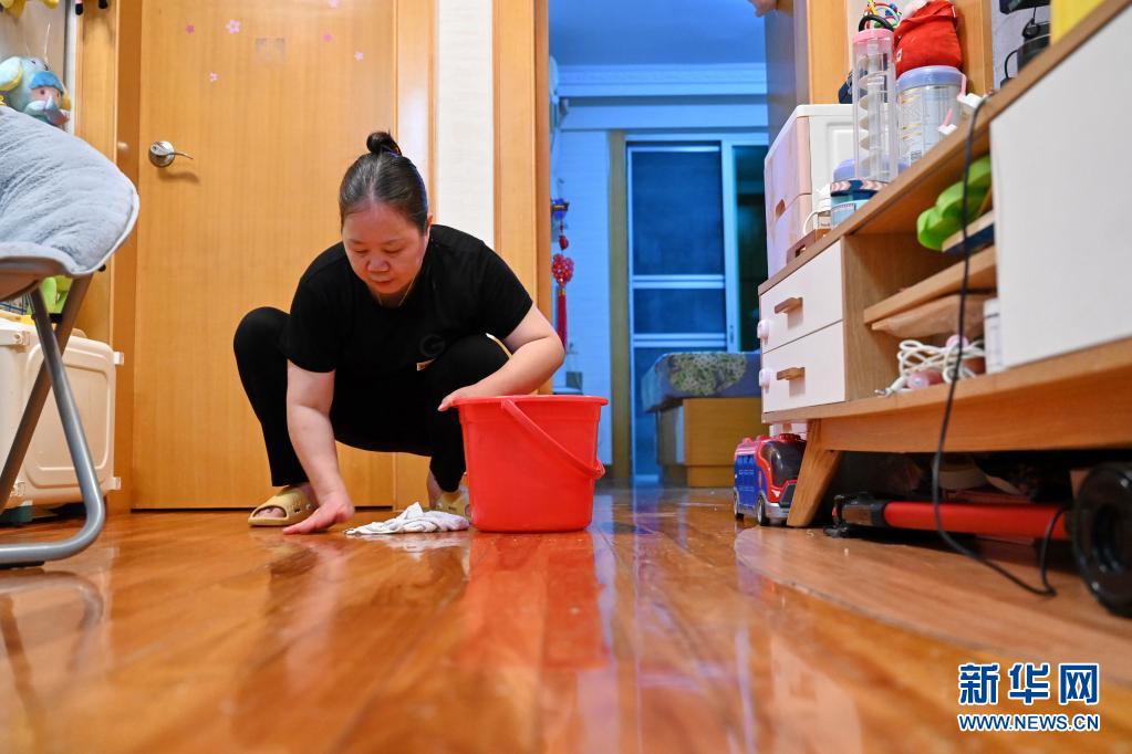 5月14日,陈键宁在擦地板。