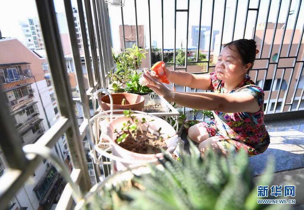 5月15日,陈键宁在自家阳台上给花草浇水。