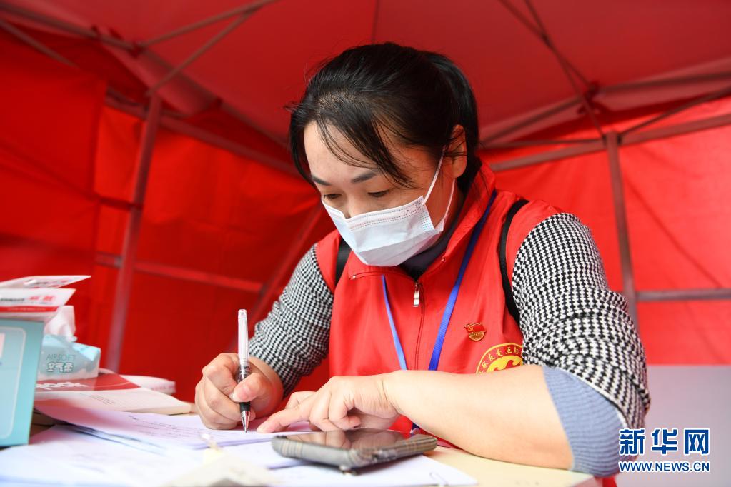 5月20日,在封闭管控的六安市裕安区百川名庭小区,张海燕在登记居民所需要的生活物资。今年40岁的张海燕是安徽省六安市裕安区国华社区党支部副书记。近期,张海燕所在辖区内的百川名庭小区被划为中风险区,她第一时间来到该小区进行驻点工作,主要负责居民生活物资的采购,同时帮助独居老人等特殊群体解决小区封闭管控期间的生活困难。她说:“作为一名共产党员,这时候就要冲!”