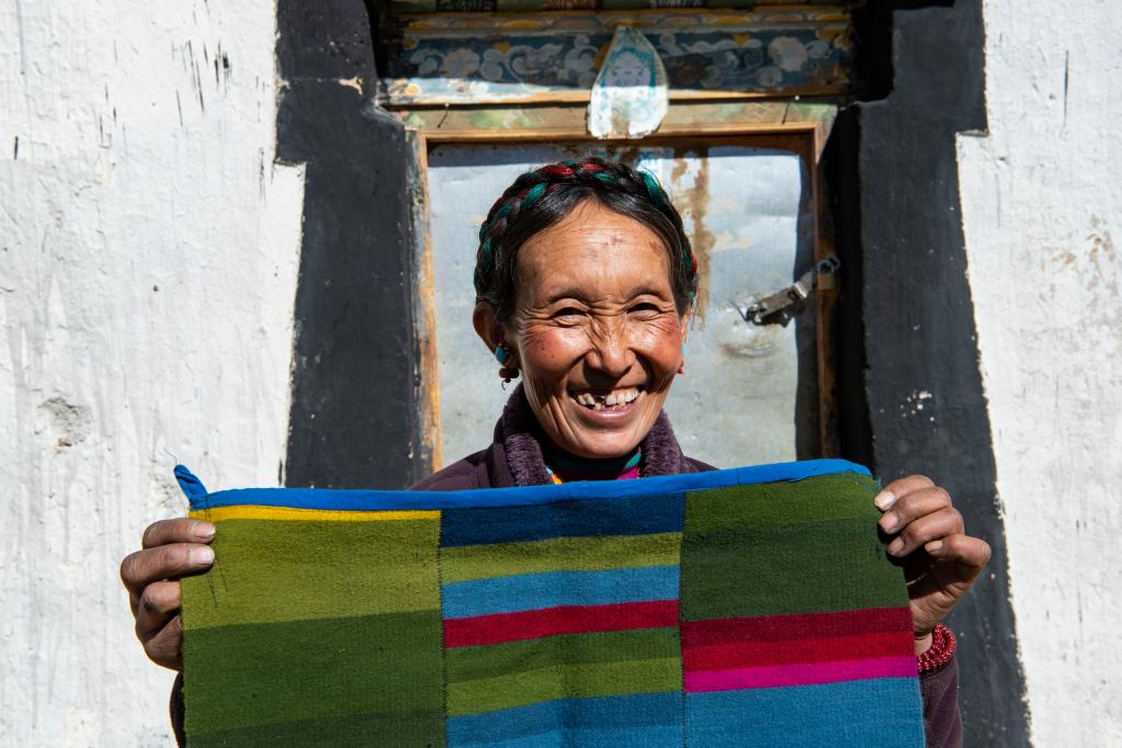 西藏自治区日喀则市定日县扎西宗乡托桑林村曾经的建档立卡贫困户格桑展示自己编织的藏族传统衣物装饰邦典(2020年1月20日摄)。新华社记者 孙非 摄