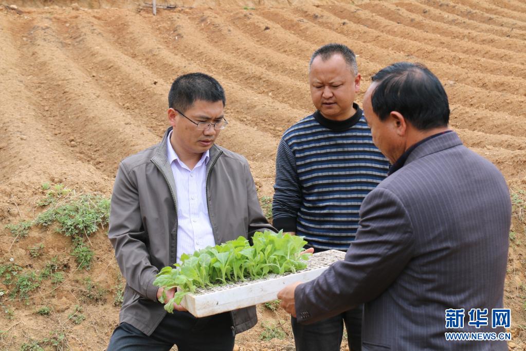 聂金辉(左)在剑川县弥沙乡调研时了解当地产业发展情况(2016年4月28日摄)。