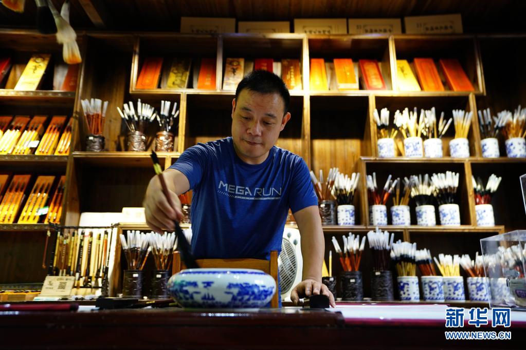 7月23日,婺源篁岭洪氏笔庄的洪永和在整理毛笔。