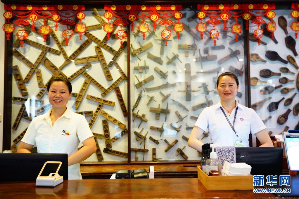 7月23日,作为工作人员的当地村民在婺源篁岭酒店前台工作。