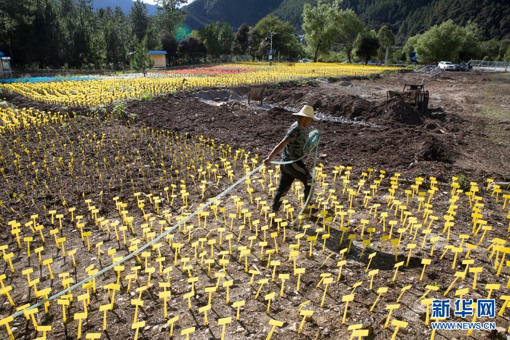 7月23日,在波密县扎木镇东若村藏天麻育苗样地,工作人员在给样地浇水。
