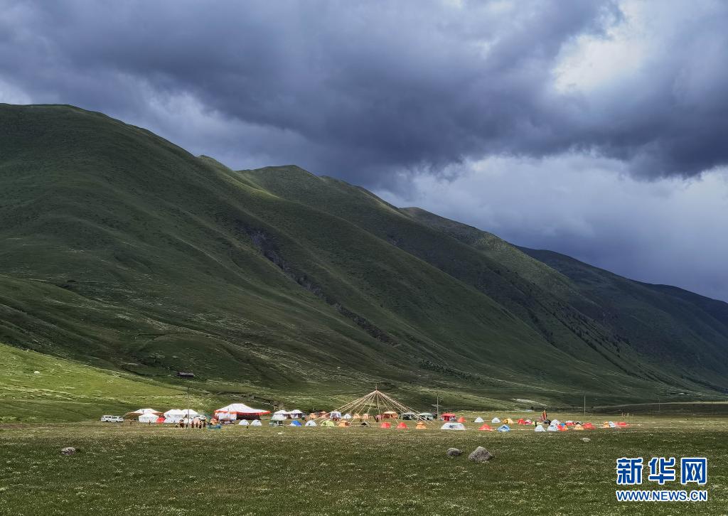 7月25日,在道孚县龙灯草原,藏族群众搭起帐篷休闲。新华社记者 江宏景 摄