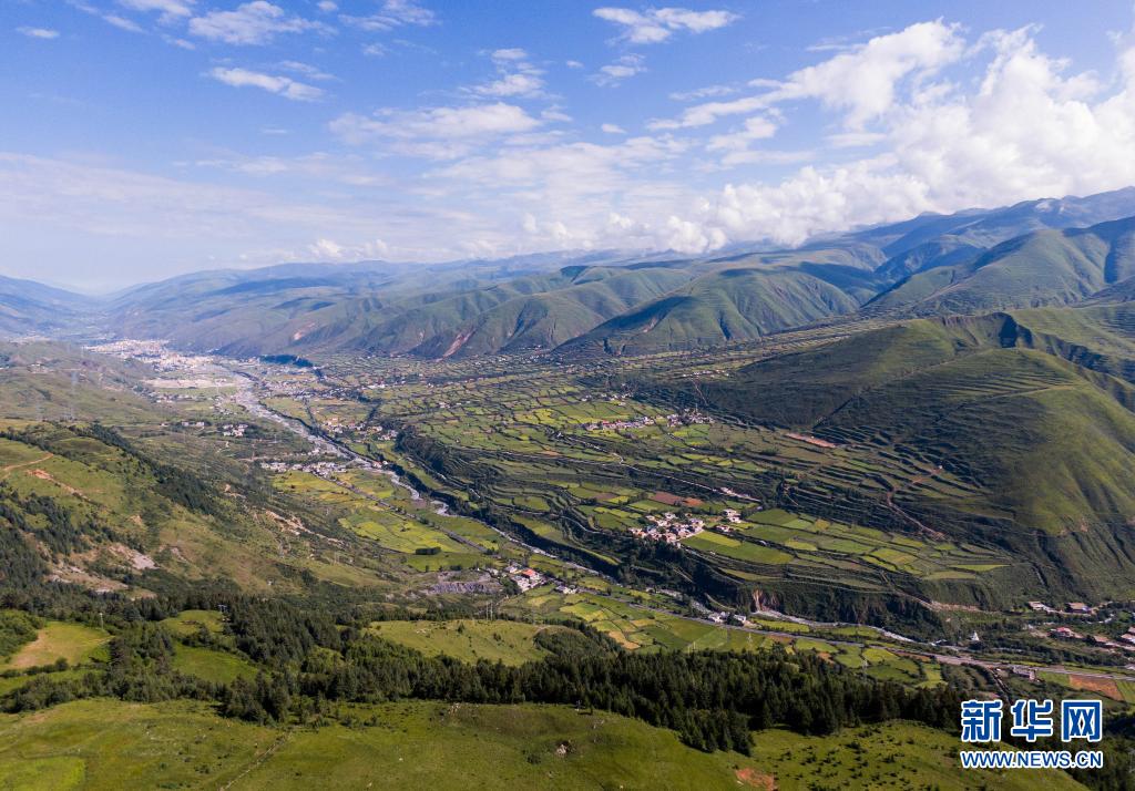 在道孚县鲜水镇,俯瞰格西河谷地带风光(7月25日摄,无人机照片)。新华社记者 江宏景 摄