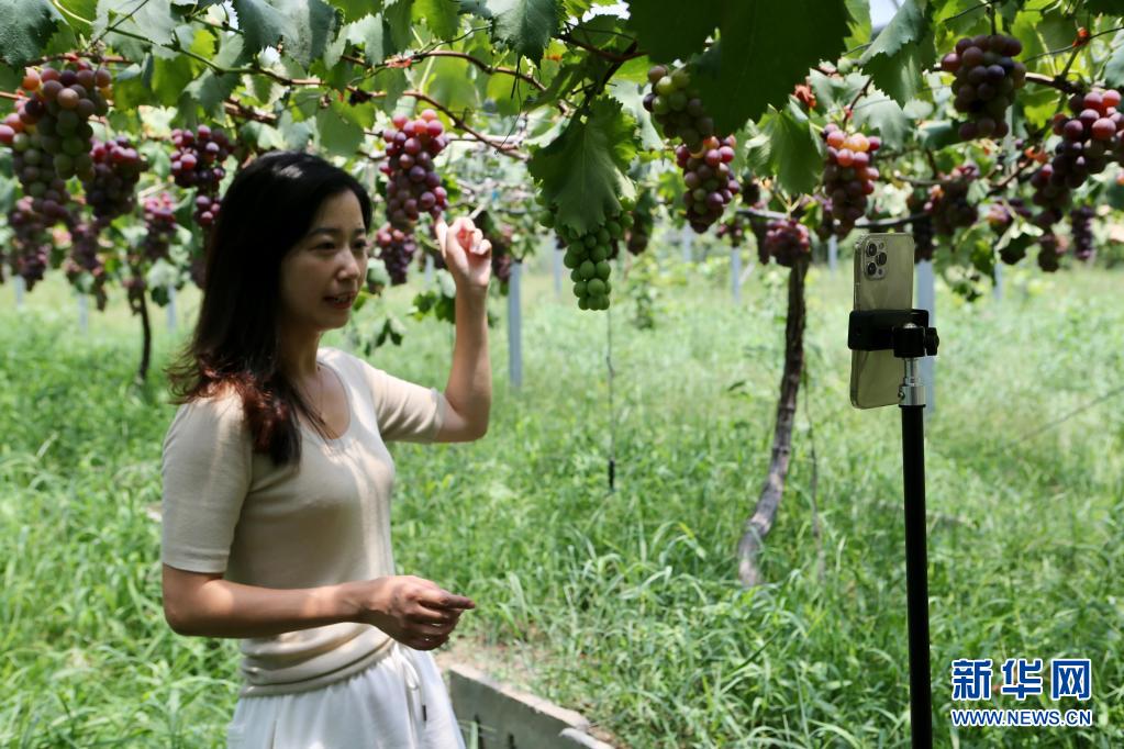 在浙江省嘉兴市南湖区凤桥镇,陈慧春在自家葡萄大棚中直播(7月21日摄)。