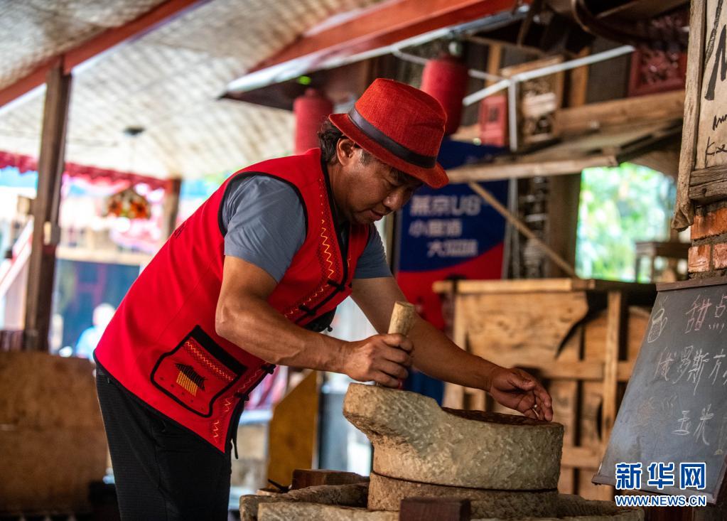 在云南省临沧市双江县的“牛圈咖啡馆”,老板艾芒在磨制咖啡豆(4月28日摄)。