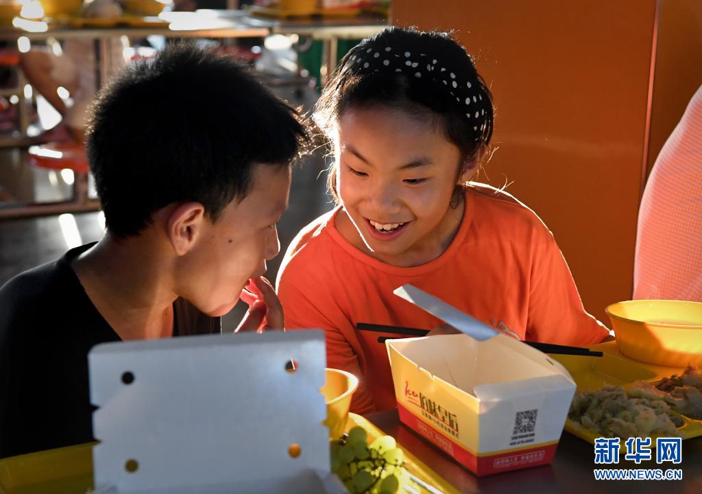 7月29日,小朋友在鹤壁市浚县黎阳中学长丰校区安置点内吃晚饭。