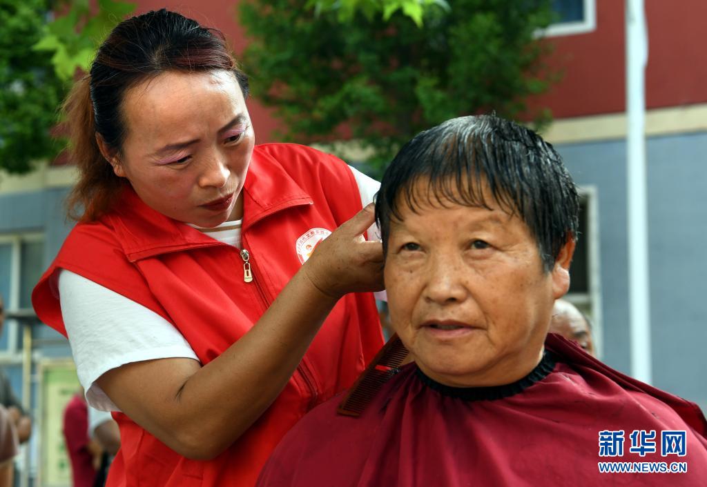 7月30日,在鹤壁市浚县科达中学安置点,志愿者在为转移人员理发。