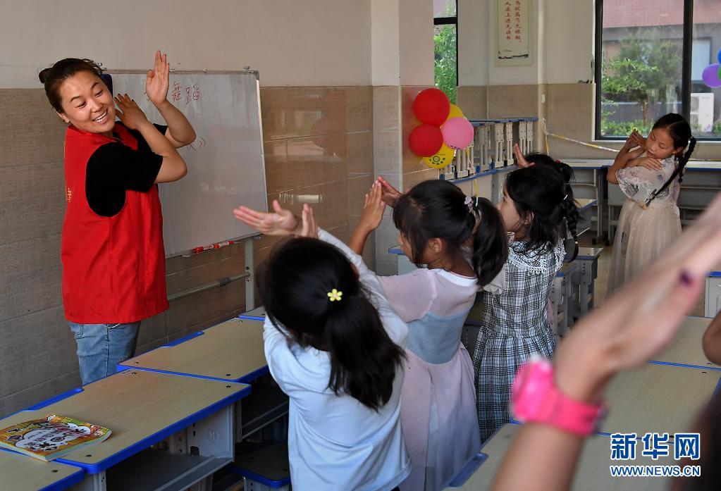 7月29日,在鹤壁市浚县黎阳中学长丰校区安置点,志愿者带领小朋友学习舞蹈。