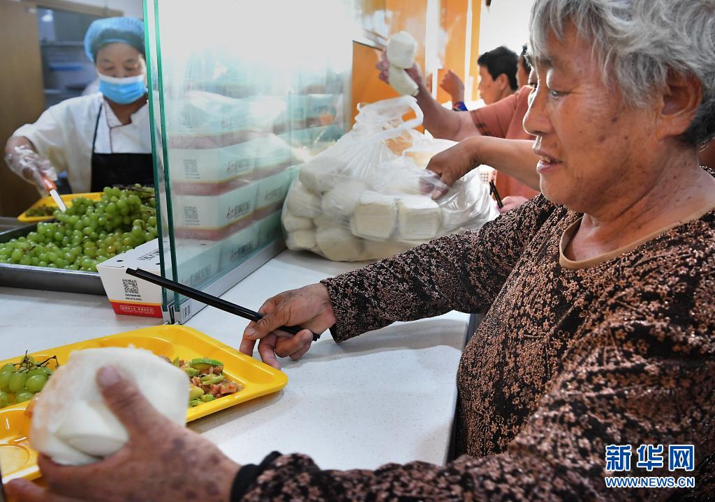 7月29日,在鹤壁市浚县黎阳中学长丰校区安置点,转移人员在打饭。