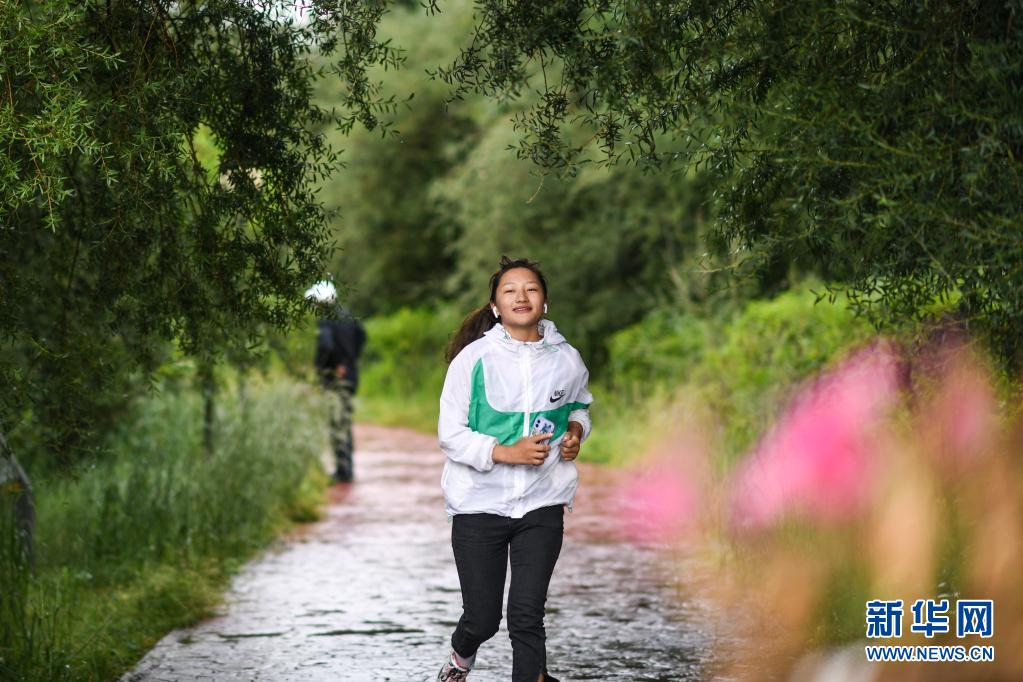 8月7日,市民在玉树市巴塘河国家湿地公园晨跑。