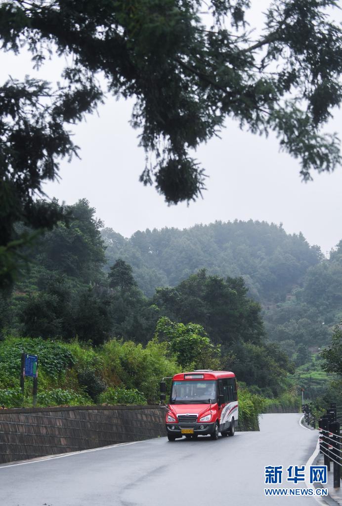 8月17日,公交车从海拔800米的诸暨市赵家镇桃岭村前往山下的镇区。新华社记者 徐昱 摄