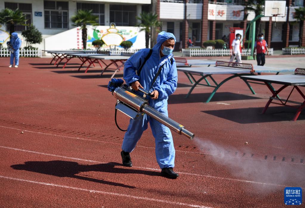 8月31日,在安徽省滁州市来安县水口镇中心学校,志愿者对学校操场进行消杀。