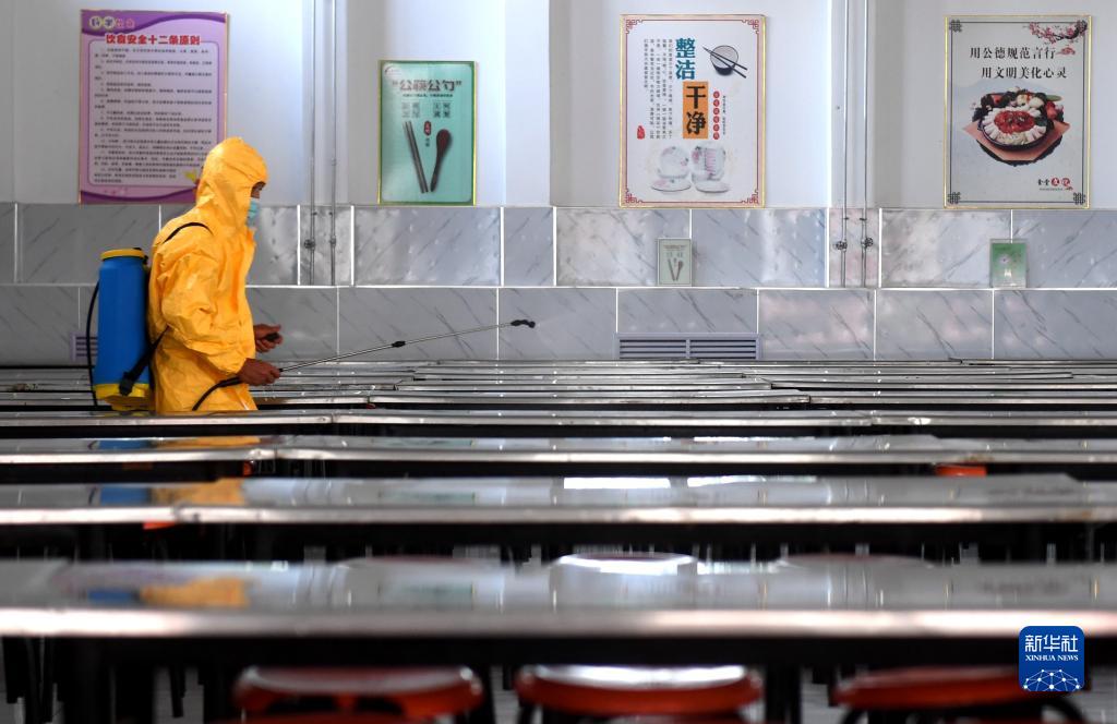 8月31日,工作人员在河北省永清县第二中学食堂进行消毒。