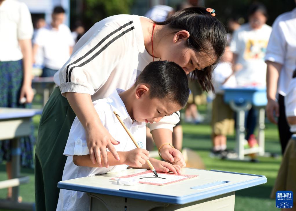 8月31日,在合肥师范学院附属实验小学,家长带着一年级新生在“开笔礼”仪式上用毛笔写“人”字。
