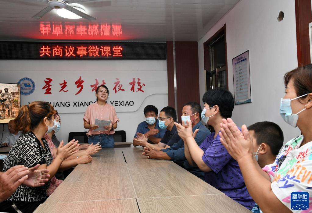 8月31日,胶州市李哥庄镇双京新村党支部书记薛巧慧(中,站立者)召集村民对新开设课程进行商讨。