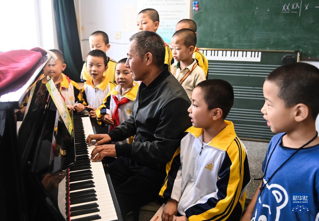 在山西省晋城市阳城县次营镇中心学校,武爱国在音乐课上教学(9月6日摄)。