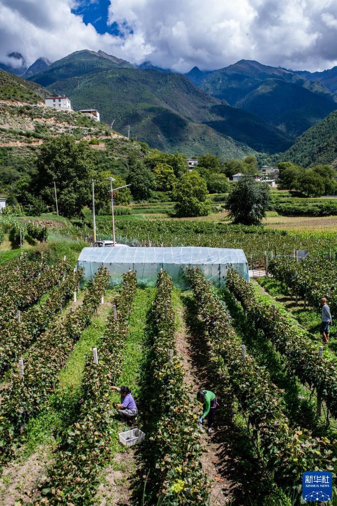 9月14日,云南省迪庆藏族自治州德钦县云岭乡红坡村农民在田里采摘葡萄。新华社记者胡超 摄