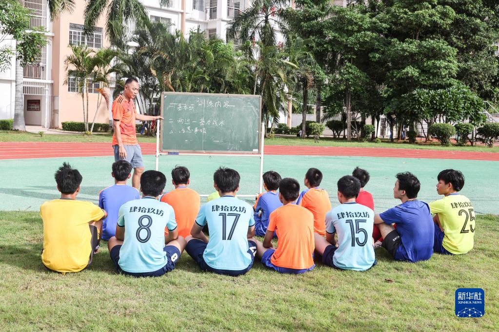这是海南(海口)特殊教育学校的体育老师梁其道(后)在给足球队员讲解动作(9月14日摄)。