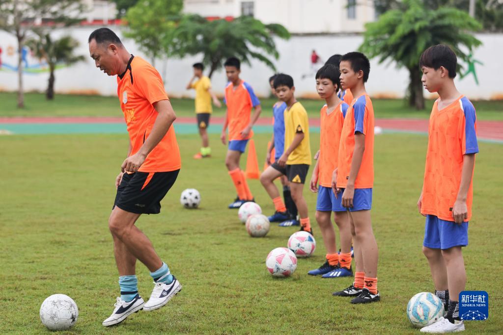 这是海南(海口)特殊教育学校的体育老师梁其道(左)在给足球队员示范动作(9月23日摄)。