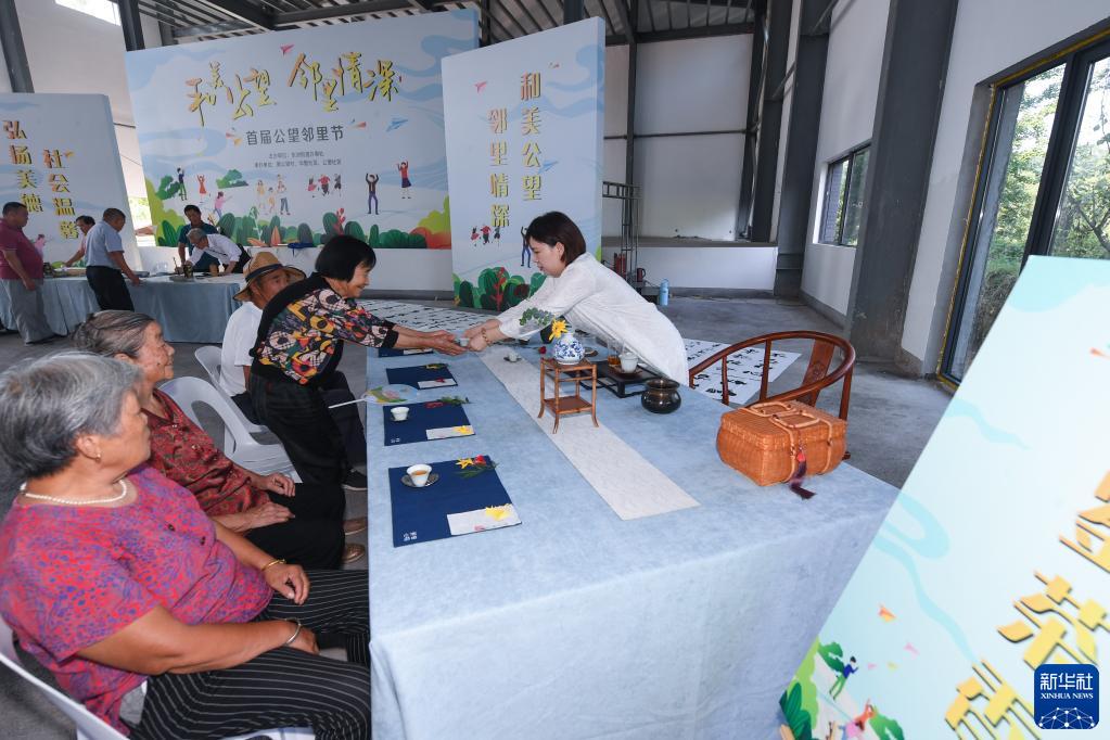 9月26日,村民在“邻里节”现场体验茶道。