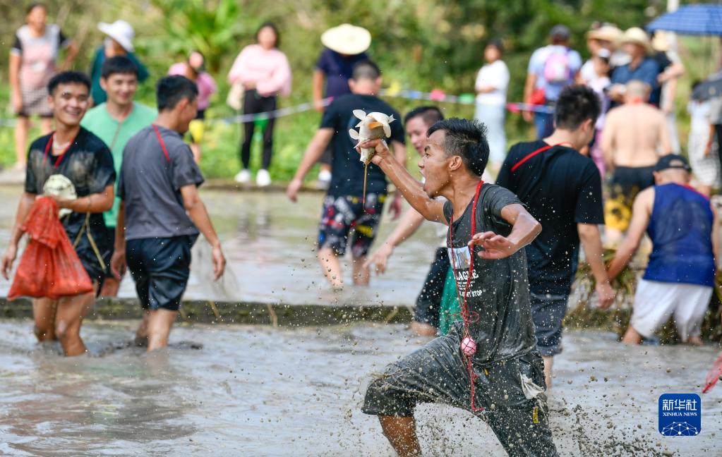 10月2日,在贵州省剑河县太拥镇昂英村,游客和村民参加抓鱼比赛。