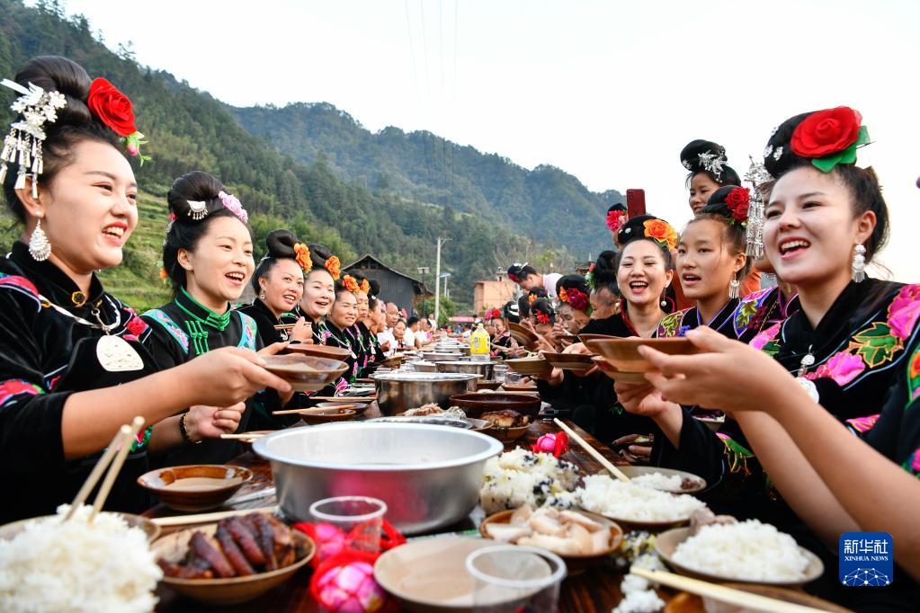 当日,贵州省黔东南苗族侗族自治州剑河县太拥镇昂英村举办“开鱼节”活动,村民和游客通过抓鱼比赛、跳芦笙舞、长桌宴等形式,庆祝苗寨丰收,欢度国庆假期。